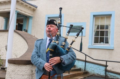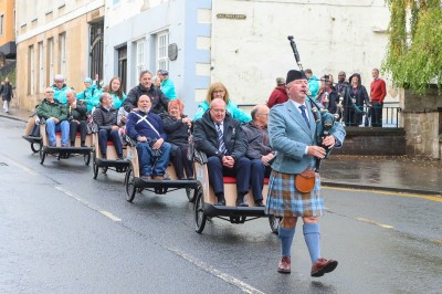 After some warm words from Mr Dey, SVR Chief Executive, Martin Nadin and Jean Weir and Christine Bell of CWAS; the two Whitefoord House Trishaws headed a procession, led out by piper Neil Clark. The Trishaws made their way down the Royal Mile, through Holyrood Park, before a parade outside the Scottish Parliament building.